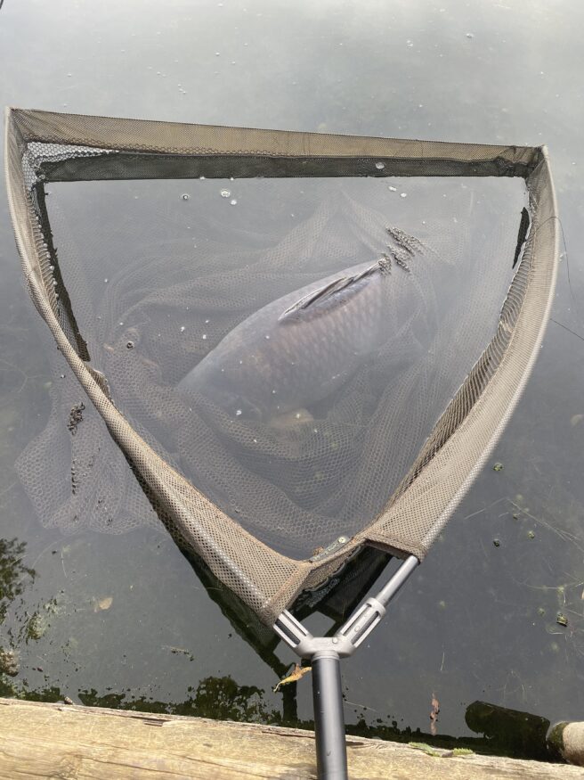 I knew the main area in front of me was weed free so whilst keeping the pressure up I let the fish plod up and down until eventually the pressure told and the fish rolled over on it’s side defeated and I gently pulled her over the cord into the awaiting net. I already knew it was another good’un… and boy was I right as I had that “this will need two hands” feeling as I lifted the net and laid the beast down and unfolded my prize, she was an absolute lump!