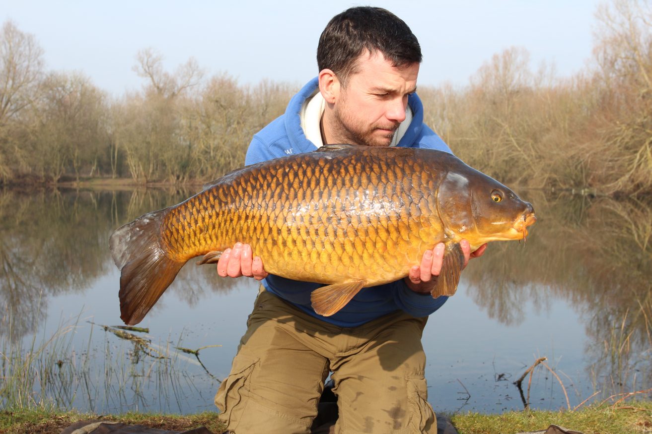 “By the time the morning came I was still in the land of nod due to the lack of sleep and that was interrupted by a one toner, and after a long tussle a 24lb common rolled into the net and the trusty size 4 Kurv Shank had held firm. “I managed a couple more overnight sessions over that two week period and caught a further five fish, and had them on a mixture of Shelf life Monster Red and Royal Marine boilies to a silty trough at short range. Hookbaits were a mixture of our bright fluoros with the soon-to-be-released liquid pastes. “On the last trip a very large fish rolled around 60 yards out to my left and I quickly wound in a rod, re-applied some more liquid paste, and cast my rig out to that area, feeling the lead land with a satisfying thump indicating that it was firmer amongst the weedbeds. “Just five minutes later the rod hooped round and this had me scrambling to apply some side strain to avoid the near margin snags, and it instantly felt heavier than the previous fish I’d had. “I had an inkling that it could be the big common, and after a very slow and ponderous fight I was starting to win the battle and caught a glimpse of a chestnut flank and was in no doubt as to what I was attached to. “My legs started to shake and I prayed for a solid hook hold, and could see that the Heli-Safe had dropped the lead and the common surfaced just yards from my net, and after a few more lunges it was beaten and in the net. “Elliott Gray was due down in the next few minutes so I waited for him to help weigh it and knew he’d take some great shots. It was venting large amounts of Monster Red all over the mat so this fish had been getting away with it on the main baited patch. “I was floating on a cloud, and from lying in a hospital bed for ten weeks I found that all that was truly important was family, friends, and fishing!”
