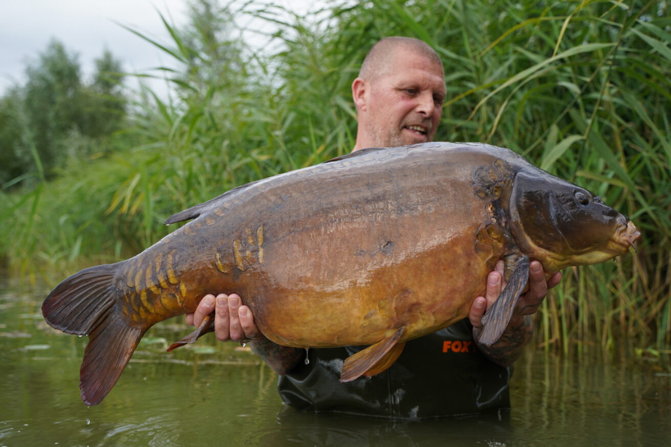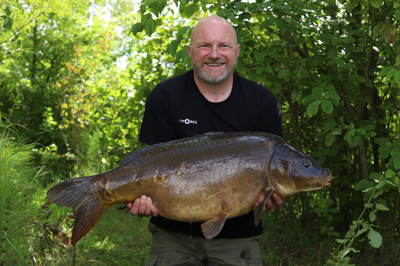 The take came shortly after he’d settled the line and what a prize it was, a real gem of a mirror, one known as black spot at 39lb. Whats more is that it beat his long standing (13 years in fact) PB so as you can imagine it was a wonderful occasion to share Andy’s moment and we all shock his hand and left him to embrace what has just happened!