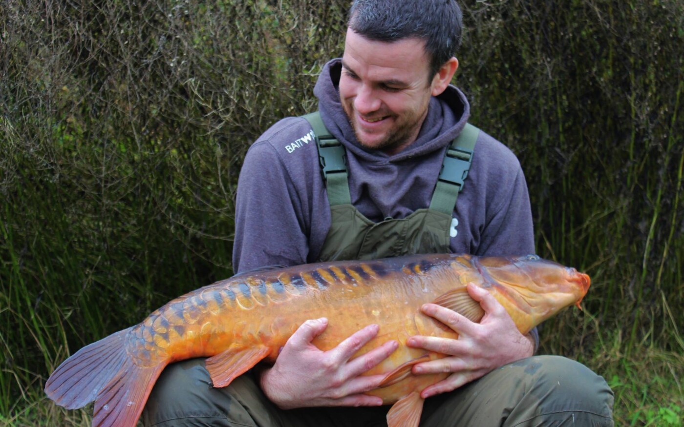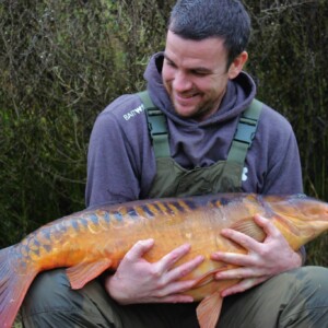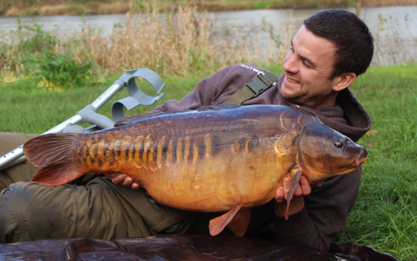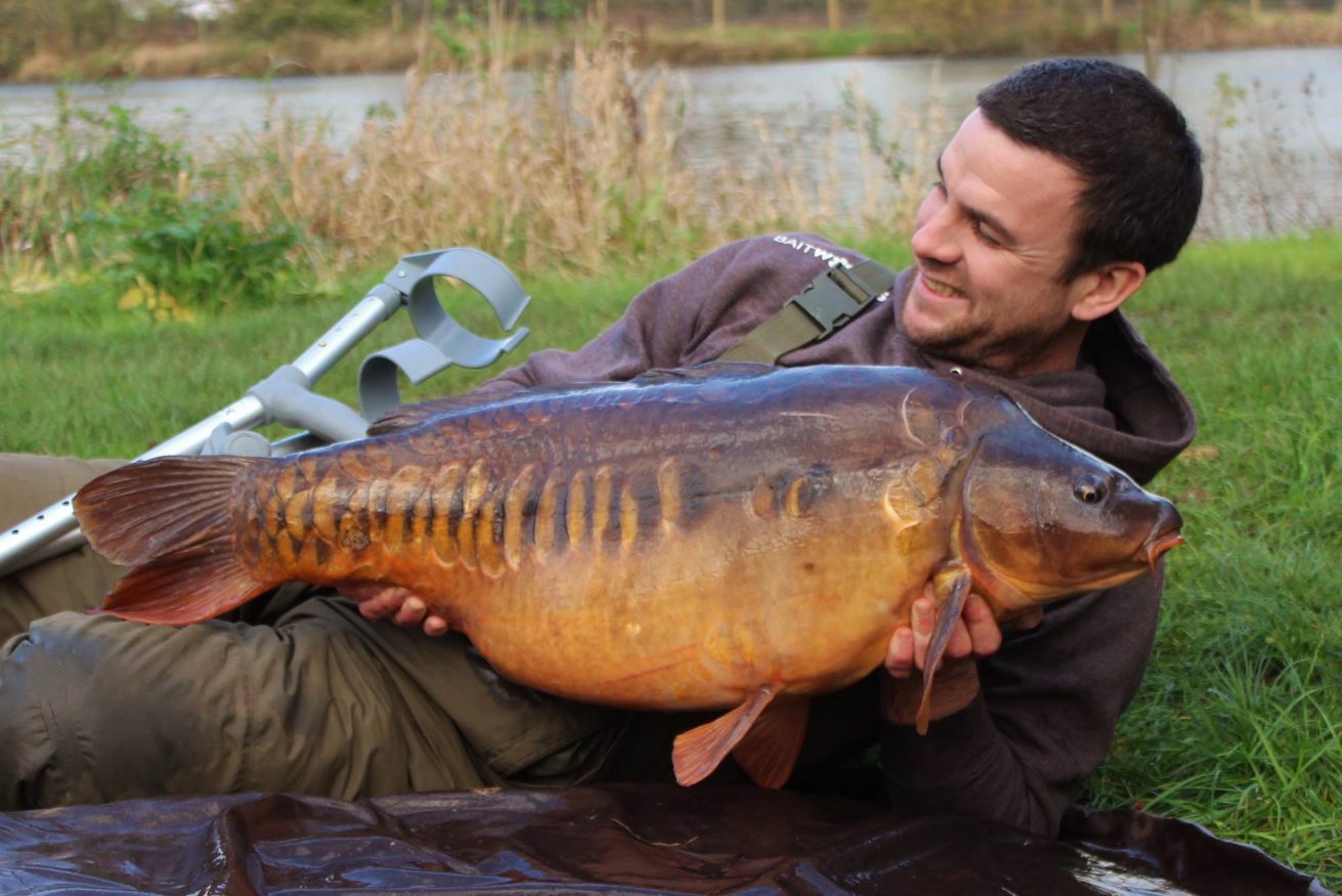 After a tremendous tussle that was beginning to make both my back and rebuilt pelvis ache, the fish finally surfaced in front of us. We all gasped as a good fish came inching over the landing net and YES! It was mine. It’s hard to put into words how I felt at that moment and all I could do was shed a tear in a time of reflection over all the emotions of the last ten weeks. Luckily, the boys didn’t see this as they were to busy looking at the massive mirror that lay in my net! I composed myself and let the boys go onto autopilot, tending to the fish and weighing it. For the record it went 30lb 12oz and was a new thirty for the Churn Pool. The weight was irrelevant to me, as any fish that day would have stirred the same emotions. Tom Pollard came down to help with the photos and helps figure out how I was going to lift the fish! In the end we managed to come up with a plan that involved me laying next to the fish with Giles and Greg either side in case I needed their assistance.